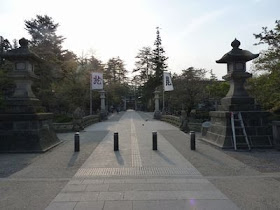 参道に「上杉鷹山」の銅像もある。鷹山公の御霊は分祀されて隣の「松ヶ岬神社」に移っている。