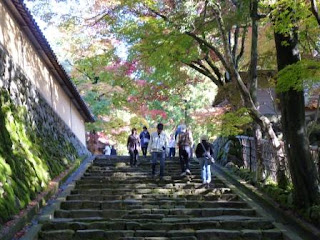 参道を行く。両側の石垣は、昔日の僧坊跡を示す。