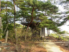 六角堂の中に「頼賢の碑・重文」が収納されている。左の建物は東屋。
