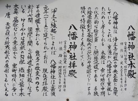「八幡神社拝殿・重文 浄土寺縁起によれば、八幡神社は嘉禎元年(1235)に建てられており、現在の拝殿はその遺構と思われる。幾多の改変ののち‥‥室町時代に多い和・唐・天竺様の折衷形式の原形ともいえる。」