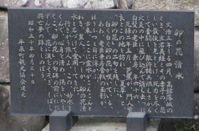 ↓「卯の花清水 文治五年閏四月、高館落城の時、主君義経とその妻子の、悲しい最後を見届け、死力を尽くして奮闘し、敵将諸共燃え盛る火炎の中に飛び込んで消え去った白髪の老臣、兼房、年66。元禄2年5月、芭蕉が、門人曾良とこの地を訪れ、「夏草」と、「卯の花」の2句を残した。‥‥行き交う旅人よ、この、妙水をくんで、心身を清め、渇をいやし、そこ、「卯の花」の句碑の前にたたずんで、花に涙を注ぎ、しばし興亡夢の跡をしのぼう。」